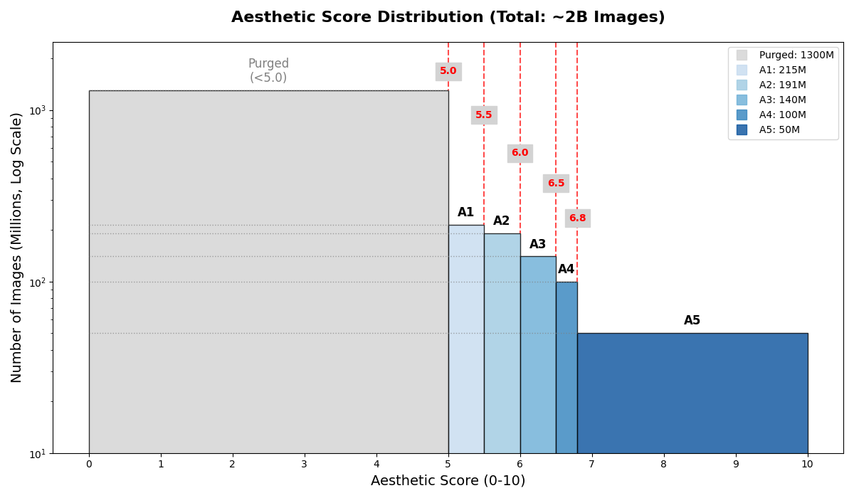 aesthetic_score >= 7.0,clip_score >= 0.95, and long-form descriptions). This tail was not augmented. The intuition: late-epoch training cared less about coverage and more about detail and composition. Pristine, semantically rich examples would prevent model collapse and force the model to refine.