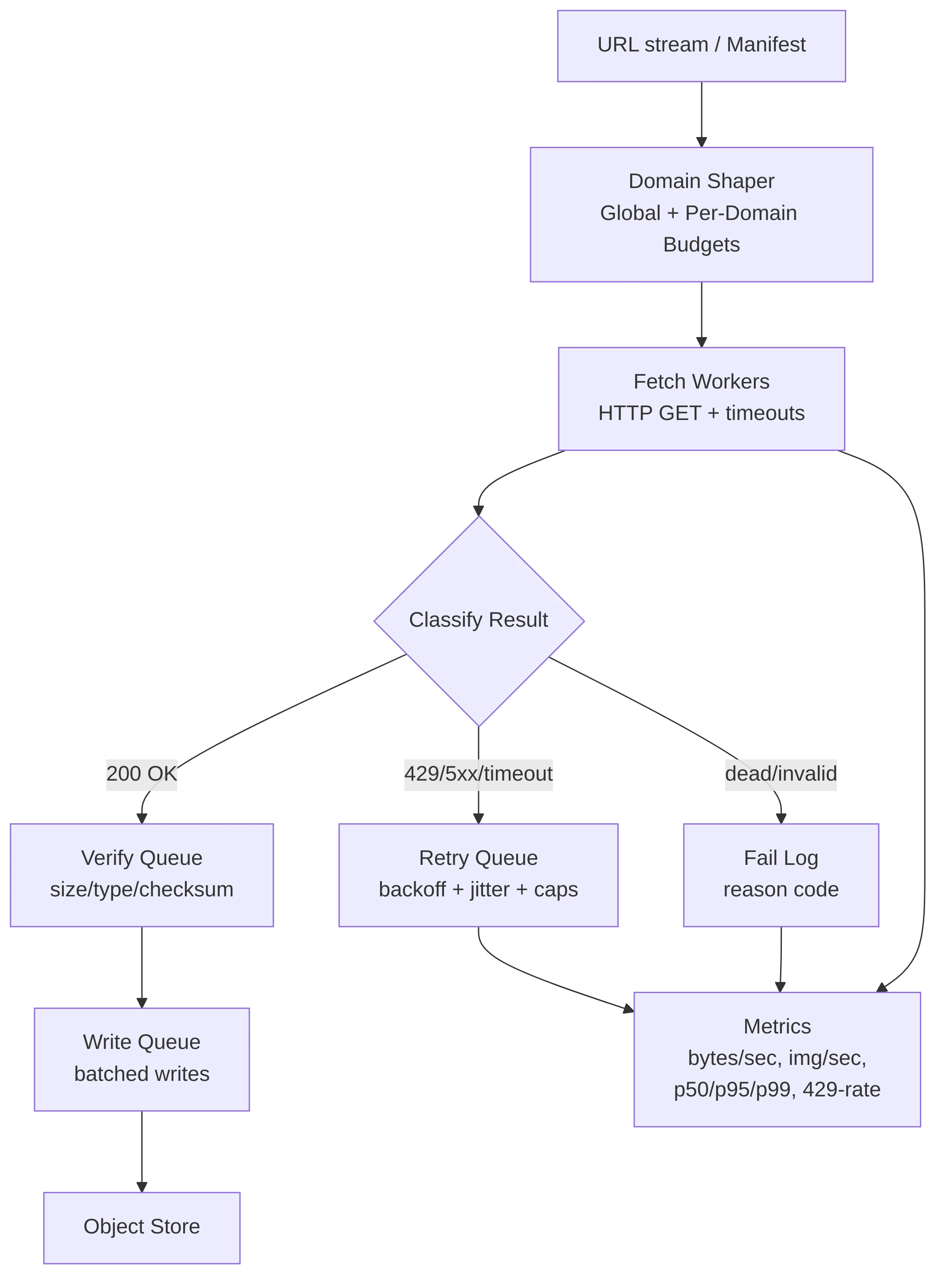 For readers who want the complete end-to-end view, the diagram below shows how metadata records moved from Parquet → Kafka topics → stage-specific worker pools → until assets landed in final object storage.