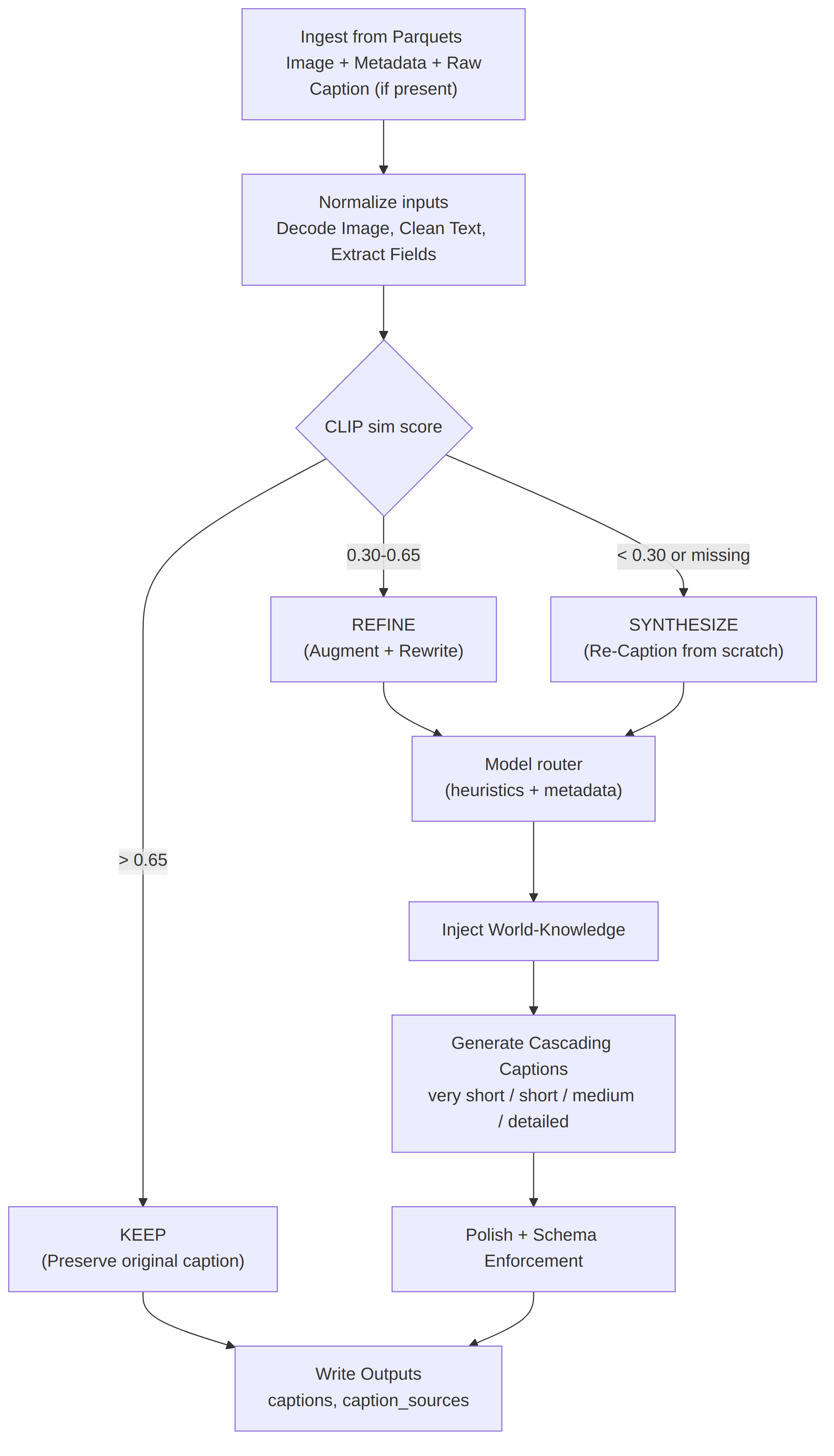 The naive approach to caption quality is discarding bad ones. At this scale, discarding bad captions would waste diversity and throw away supervision. Instead, we treated captioning as a routing and synthesis problem and not a binary keep/discard decision.