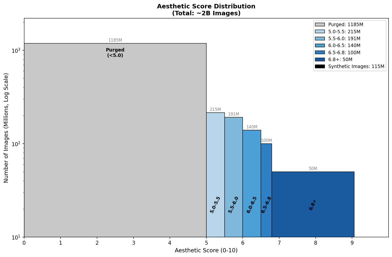 aesthetic_score >= 7.0,clip_score >= 0.95, and long-form descriptions). This tail was not augmented. This was done to introduce more detail and composition. Pristine, semantically rich examples would prevent model collapse and force the model to refine.