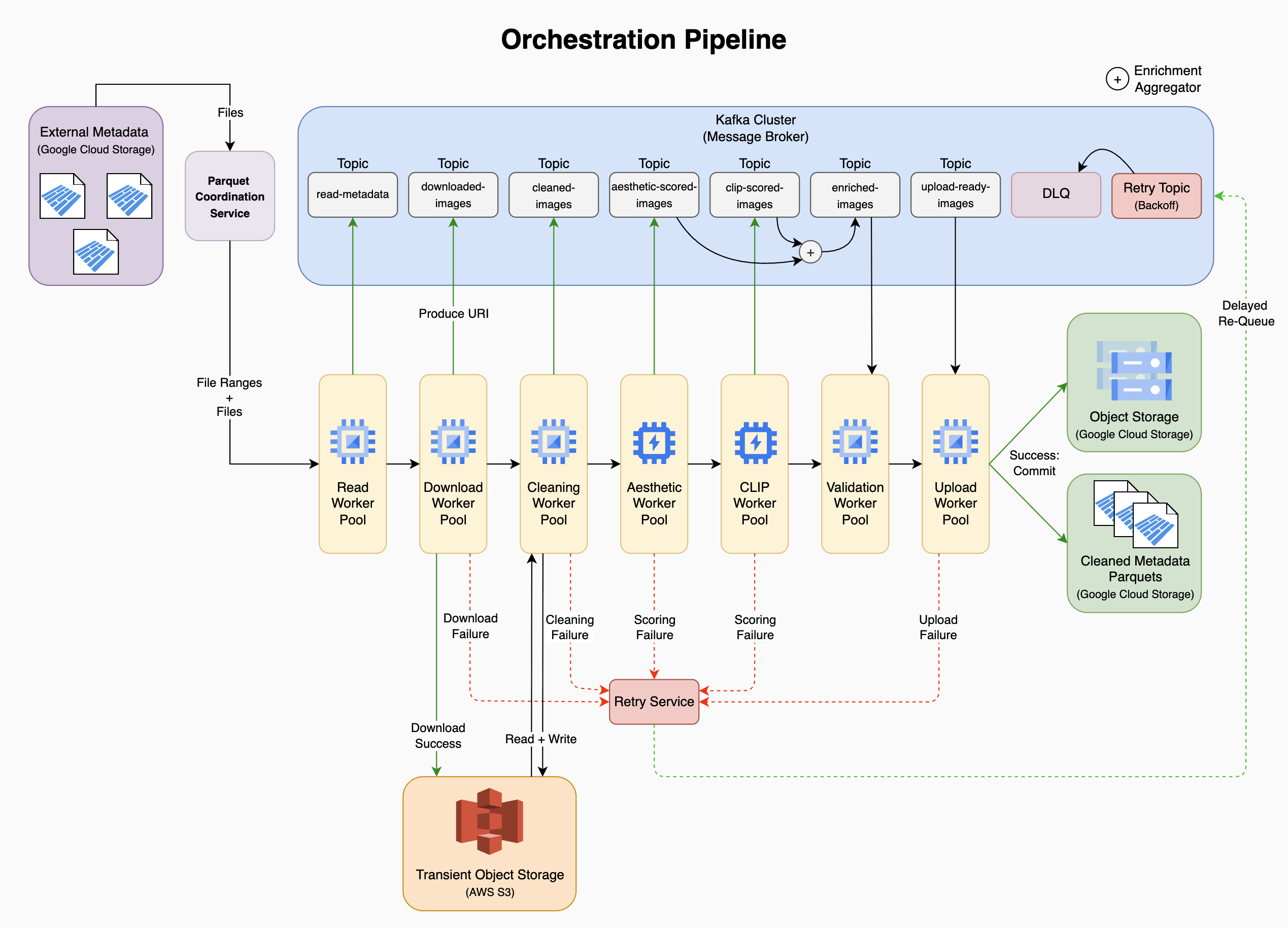 For readers who want the complete end-to-end view, the diagram below shows how metadata records moved from Parquet → Kafka topics → stage-specific worker pools → until assets landed in final object storage.