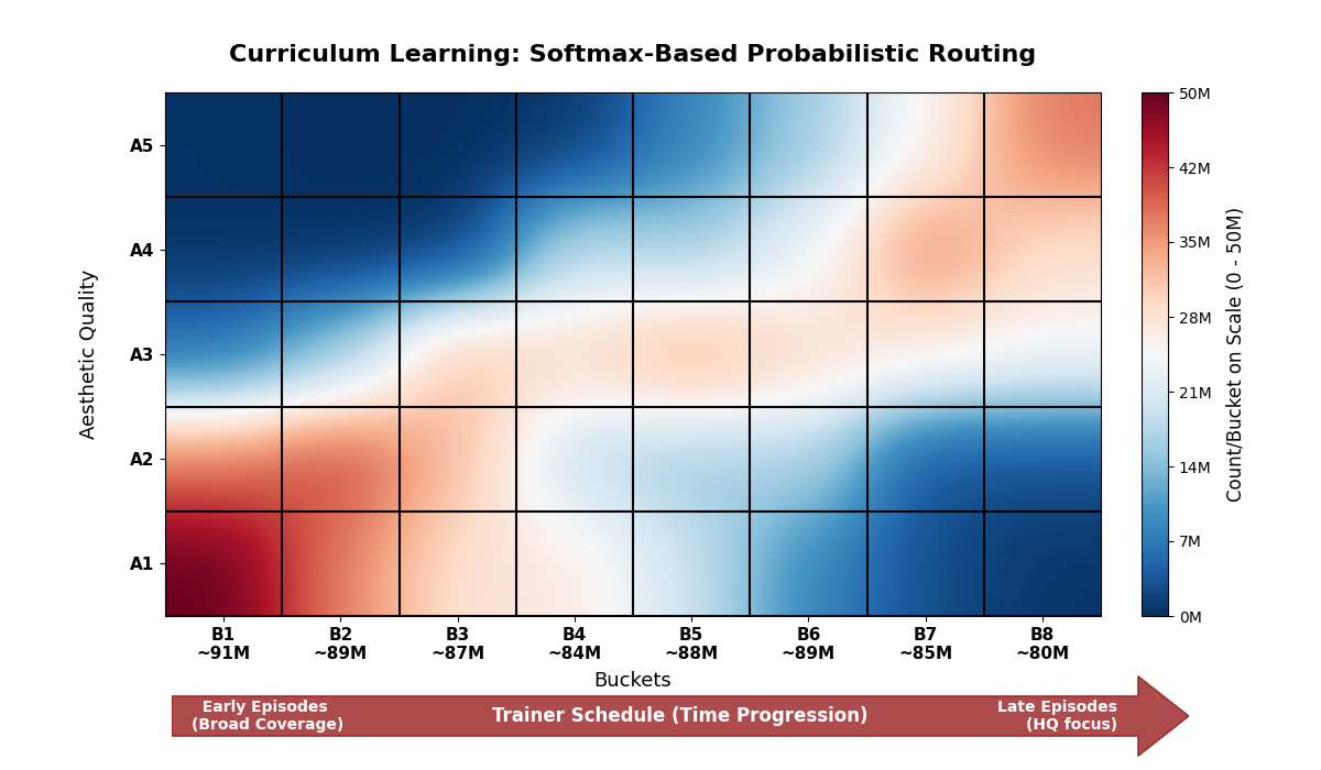 where is the temperature parameter. Higher increases overlap (early training, broad coverage), lower concentrates probability mass (late training, tighter curriculum and higher-quality emphasis). We sampled to assign the image to bucket .