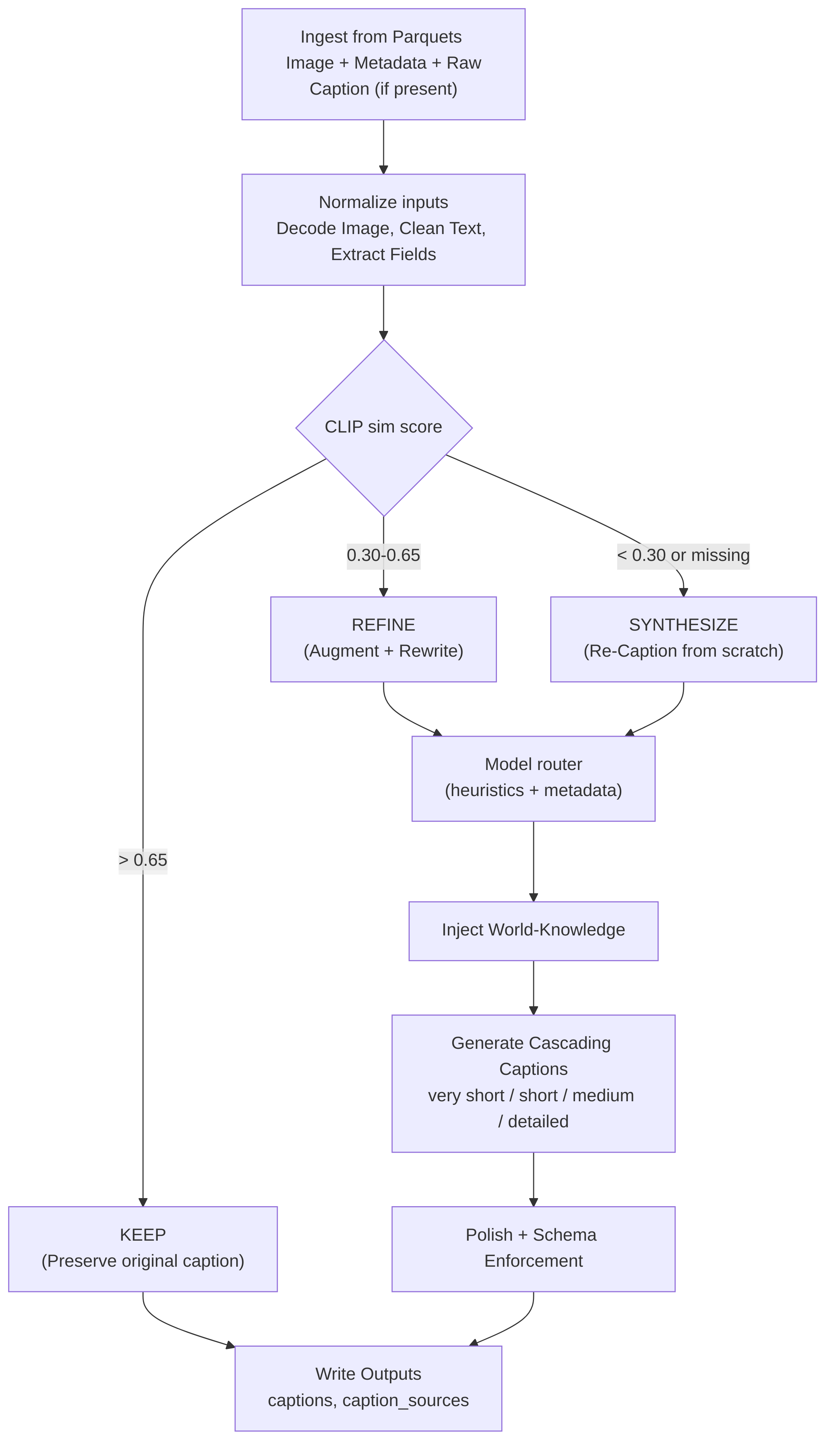 The naive approach to caption quality is discarding bad ones. At this scale, discarding bad captions would waste diversity and throw away supervision. Instead, we treated captioning as a routing and synthesis problem and not a binary keep/discard decision.
